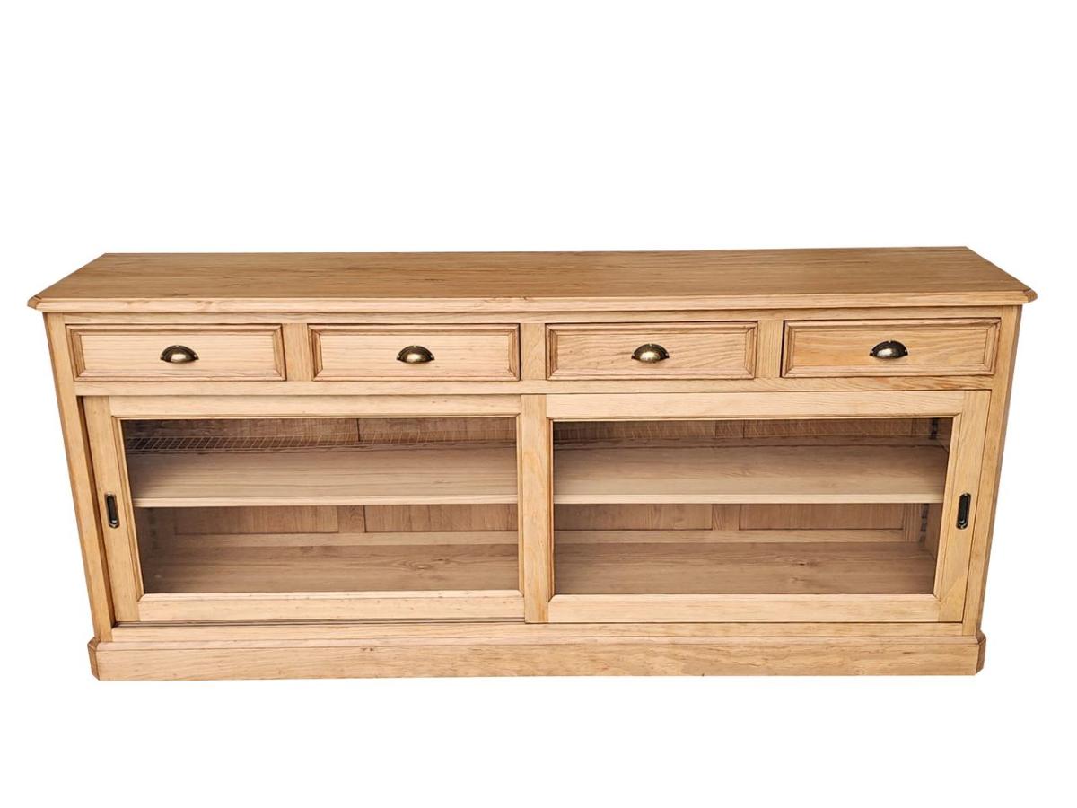 Buffet bas  ou Meuble de TV en bois Massif ( pin des landes 1er choix sans Noeuds )  comportant 4 tiroirs et 2 portes vitrées  pour un chantier d'architecte .